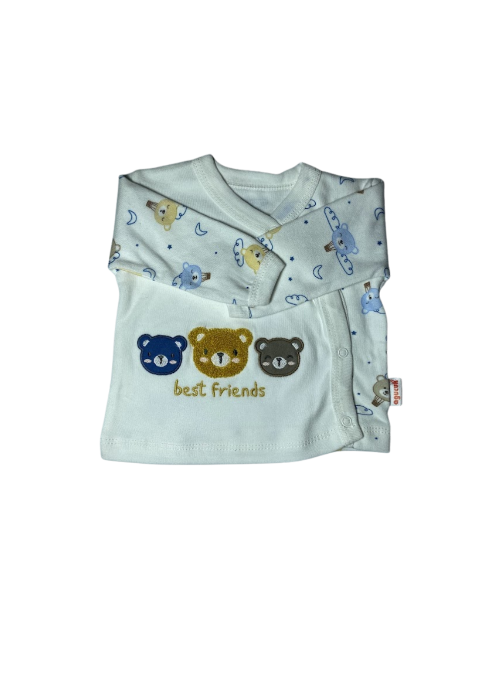 This five-piece baby clothing set is crafted from a soft blend fabric and includes a complete ensemble to keep infants warm and comfortable. The collection features a delightful "Best Friends" theme, led by a white side-snap top that displays three embroidered bear faces and whimsical balloon-print sleeves. The set is rounded out with matching blue footed trousers, a patterned bib, a beanie hat, and scratch mittens, featuring convenient snap closures on the shirt for a secure and easy fit.