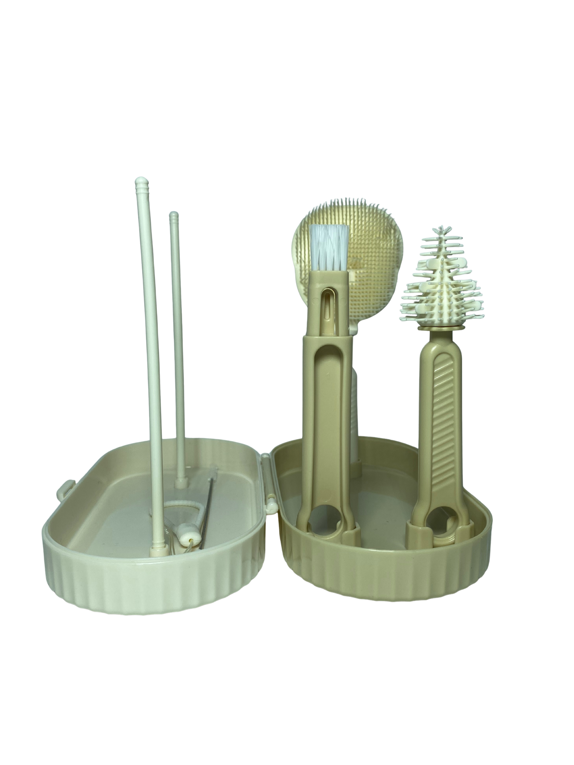 This comprehensive seven-piece feeder washing kit is crafted from durable, food-grade silicone and high-density bristles, providing a complete ensemble to keep baby’s feeding essentials hygienic and safe. The collection features a practical slate gray and cream theme, led by a large, flexible silicone bottle brush designed to reach every corner without scratching. The set is rounded out with a specialized nipple cleaner, a straw brush, and a multi-purpose detail brush for small accessories, all housed within a compact, ventilated travel case that doubles as a drying rack. Featuring ergonomic, non-slip handles for a secure and comfortable hold, this kit is an essential tool for efficient cleaning both at home and on the go.
